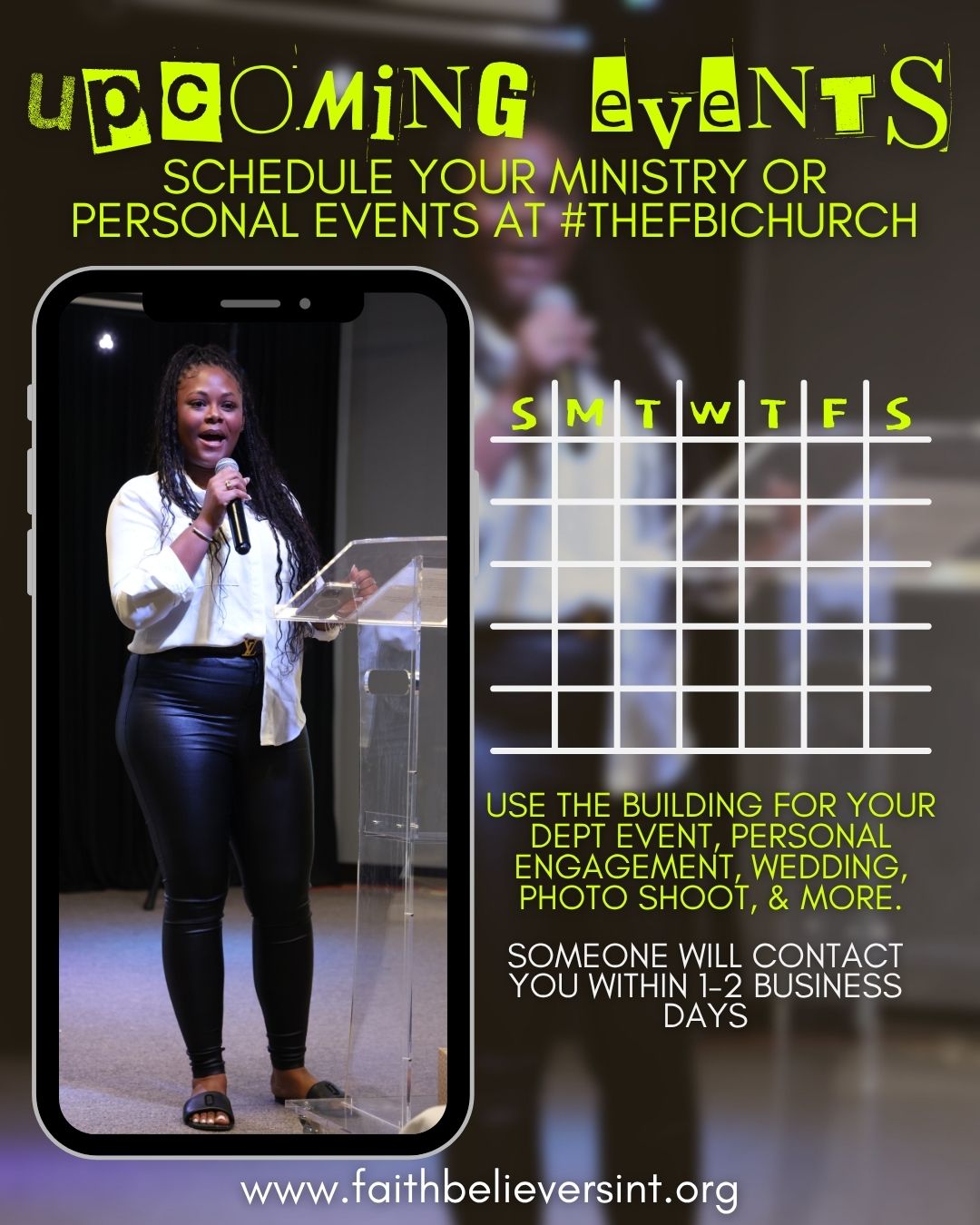 Book your ministry department event such as: Outreach, Youth Night, Marriage Nights, etc.